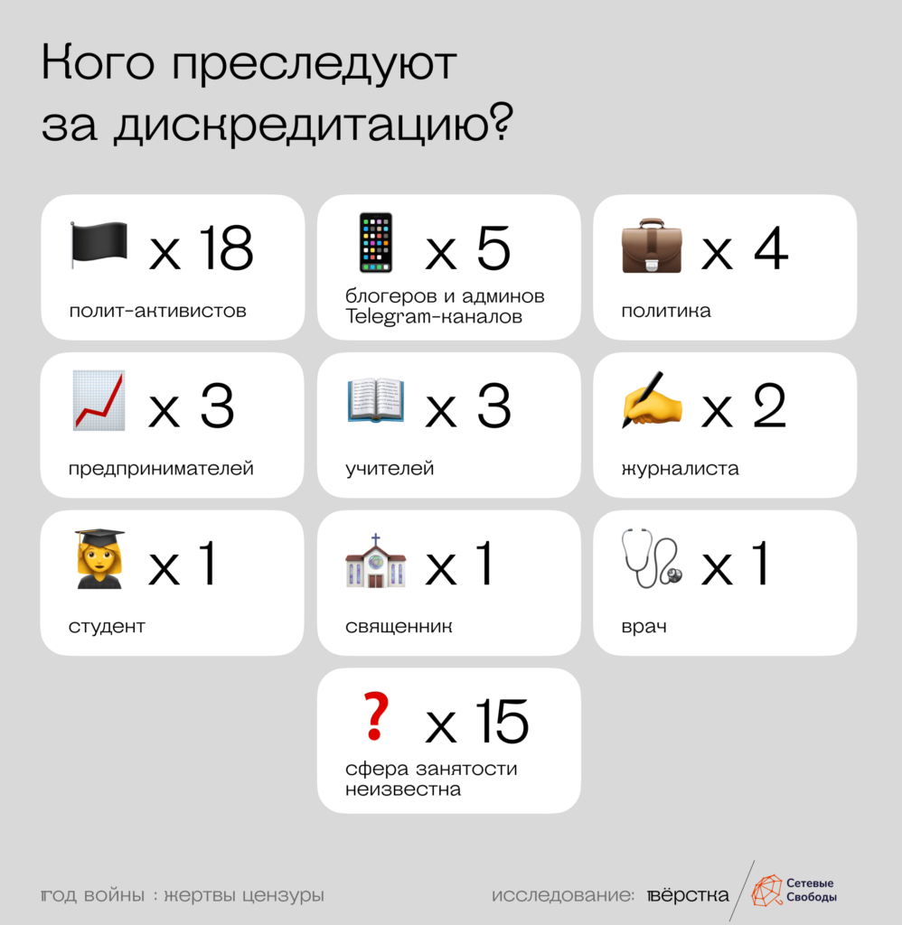 Приговоры по статье о дискредитации армии вынесли, по данным «Сетевых свобод», семи преследуемым: от штрафа в 100 000 рублей до реального срока в три года лишения свободы.