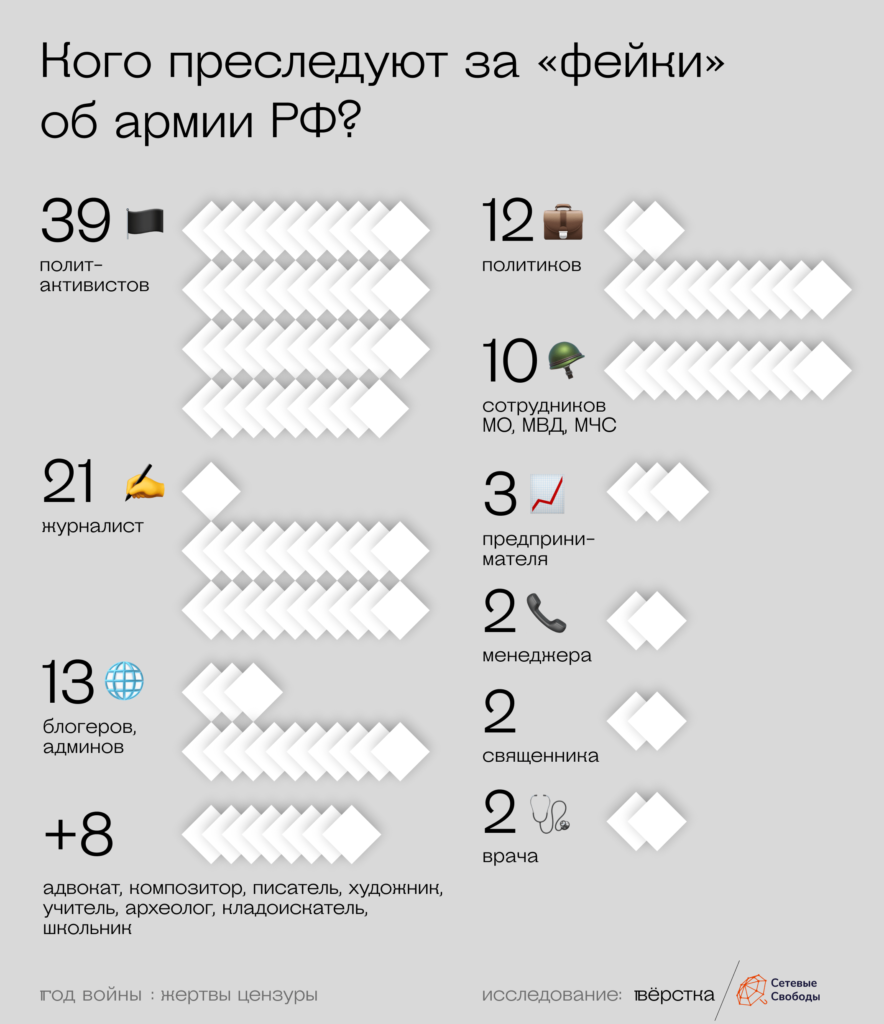 «В общей сложности по обеим статьям УК [о фейках и дискредитации] нам известно о преследовании 196 человек, — говорят эксперты „Сетевых свобод“. — У 36 из них известны приговоры. Все дела, возбуждённые весной и летом 2022 года, подходят к своему завершению. Таким образом, в 2023 году мы ожидаем резкого роста приговоров. Мы видим, что сейчас они начнут сыпаться буквально десятками в неделю».