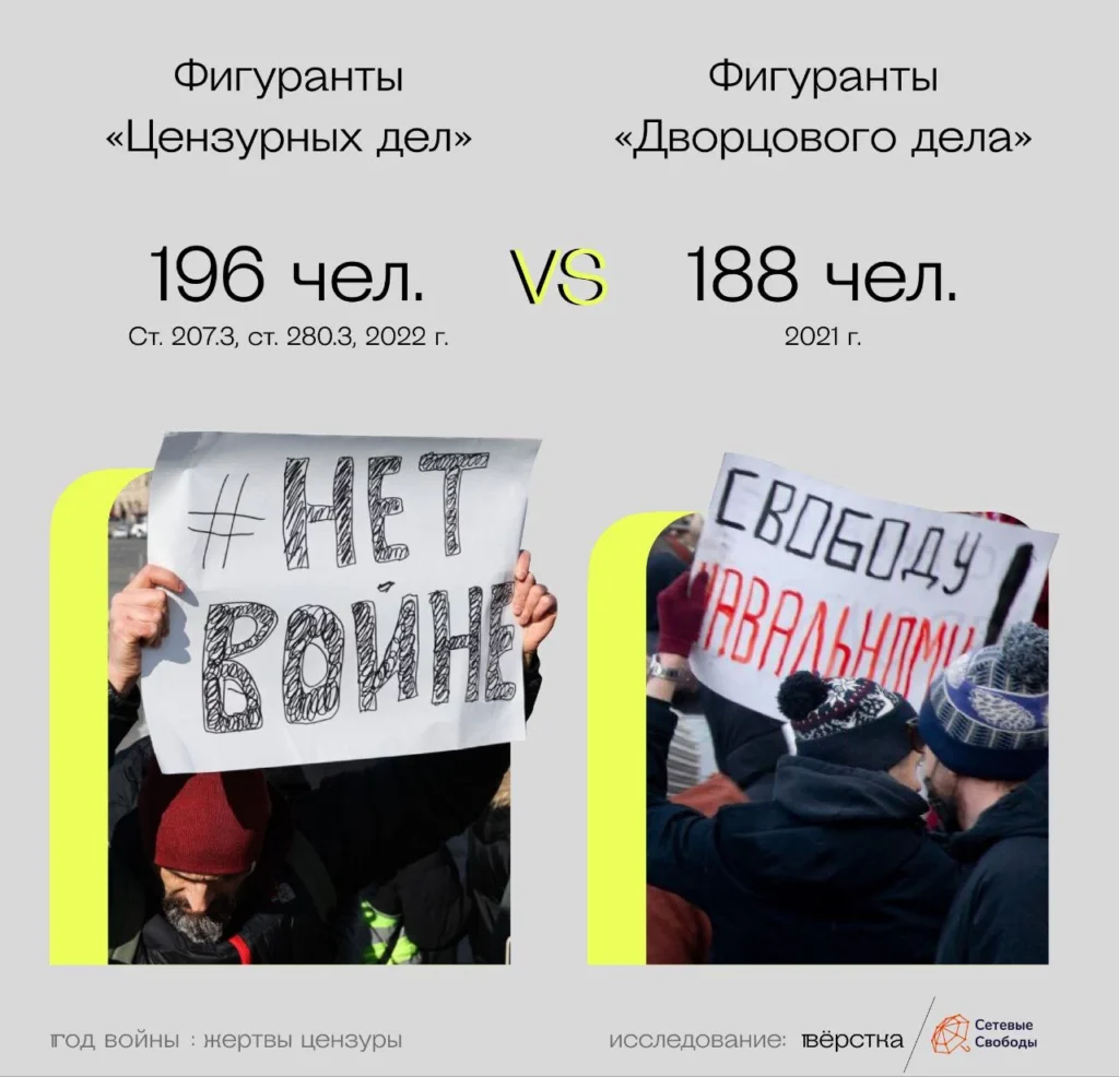 Такое количество преследуемых лишь по двум цензурным статьям превысило масштаб политических репрессий предыдущих лет. Для сравнения, фигурантами «Дворцового дела» в 2021 году — последнего самого массового преследования противников режима — стали 188 человек, следует из подсчётов «ОВД-Инфо».