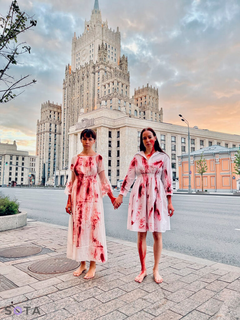 Активистки Наталья Перова и Людмила Анненкова 29 мая провели у здания Министерства иностранных дел РФ в Москве акцию «Нам не отмыться от крови». Две девушки, взявшись за руки, встали на фоне здания ведомства в белой одежде, залитой красной краской, изображающей кровь, — так они выразили свой протест против военных действий в Украине и почтили память убитых мирных жителей. За эту акцию их задержали и подвергли преследованию по трём статьям.