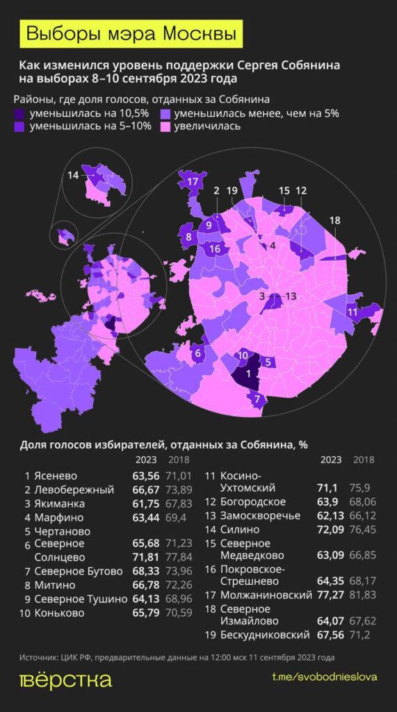 Но есть и округа, где голосов за действующего мэра стало заметно больше, чем в 2018 году. Это Лефортово (+26%), Нагатинский затон (+24%) и Даниловский район (+20%). Больше всего голосов Собянин получил в Некрасовке — рекордные 91,29%.