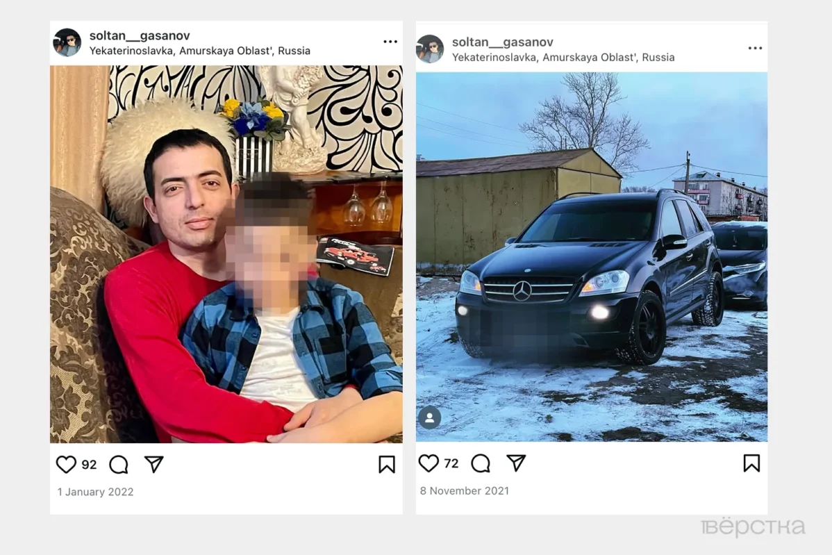 Soltan Gasanov is 39 years old; he is originally from Dagestan. One of his fellow servicemen told Verstka that Gasanov is a “good person and commander.” The information that Gasanov is in the military was confirmed to Verstka by two of his acquaintances. In 2021, the man’s Instagram had a photo of his Mercedes with a geolocation of Ekaterinoslavka. According to data leaks, Gasanov lives there.