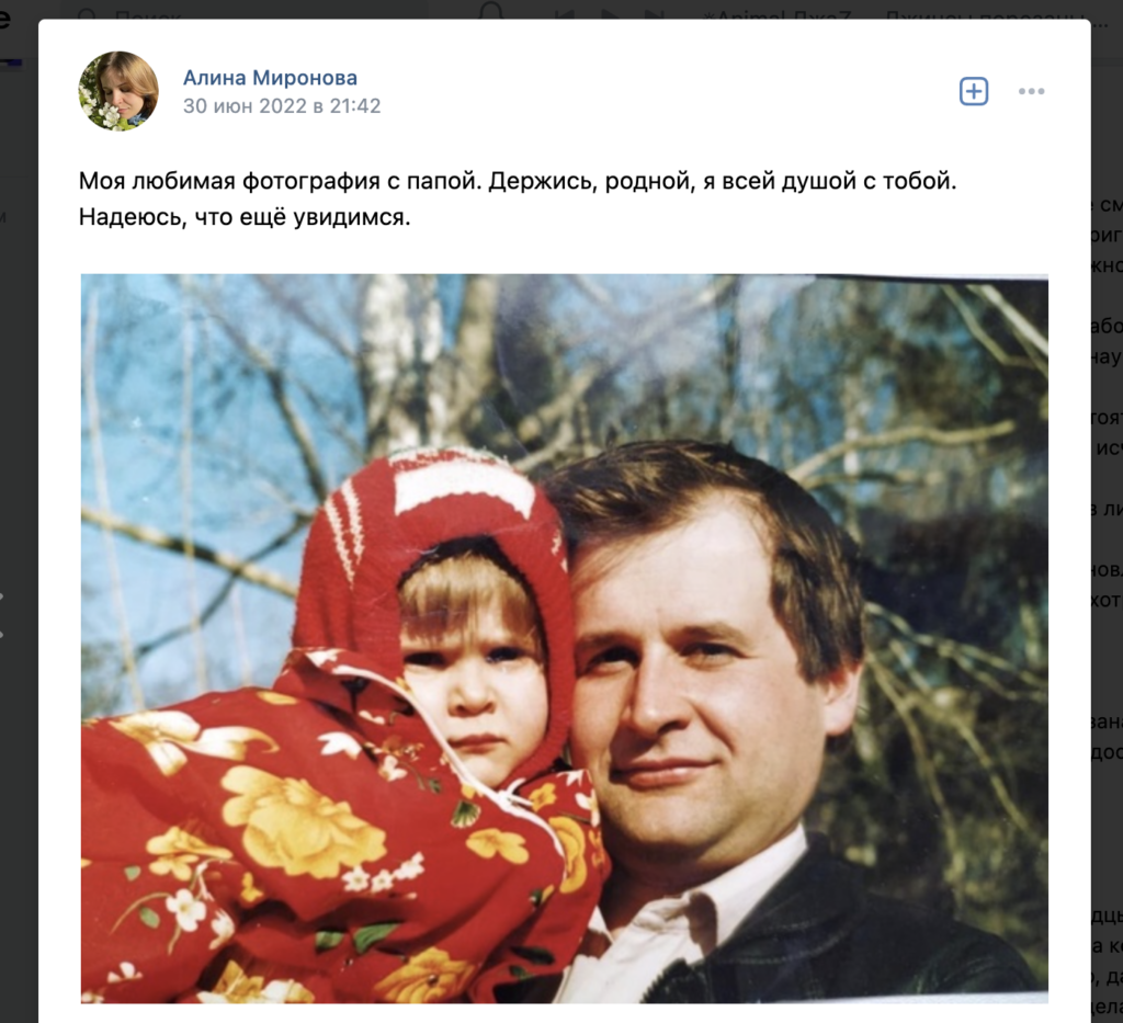 «Наша семья проходит через сущий ад, — написала она 30 июня в своём паблике. — Наш родной папа не сможет уйти из жизни в кругу семьи. Четвёртая стадия рака поджелудочной — это приговор. Но встретить этот приговор не дома, а в стенах СИЗО без должной медицинской помощи — это худшее, что может произойти с человеком. С человеком, который является настоящим патриотом, наработал знания и навыки за границей, но привёз их сюда, в Россию. Доктор наук, профессор, заведующий лабораторией. Талантливый учёный. Это светлый и добрый человек. Он не может сейчас самостоятельно питаться, организм не принимает пищу. Возможности химиотерапии исчерпаны, и ему показана поддерживающая терапия. У нас даже нет информации о его состоянии здоровья. Жив ли, увидим ли мы его снова? Сегодня его увезли из больницы сотрудники ФСБ. Этим делом уже занялись правозащитники. А что мы? Нам остаётся молиться о том, что ему будет оказана медицинская помощь, а мы, семья, ещё сможем увидеться с ним, чтобы достойно проводить в мир иной».