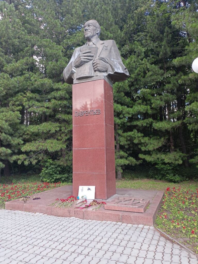 Ещё один похожий мемориал на следующий день появился у памятника академику Михаилу Лаврентьеву. Сюда полиция прибыла уже через полчаса.