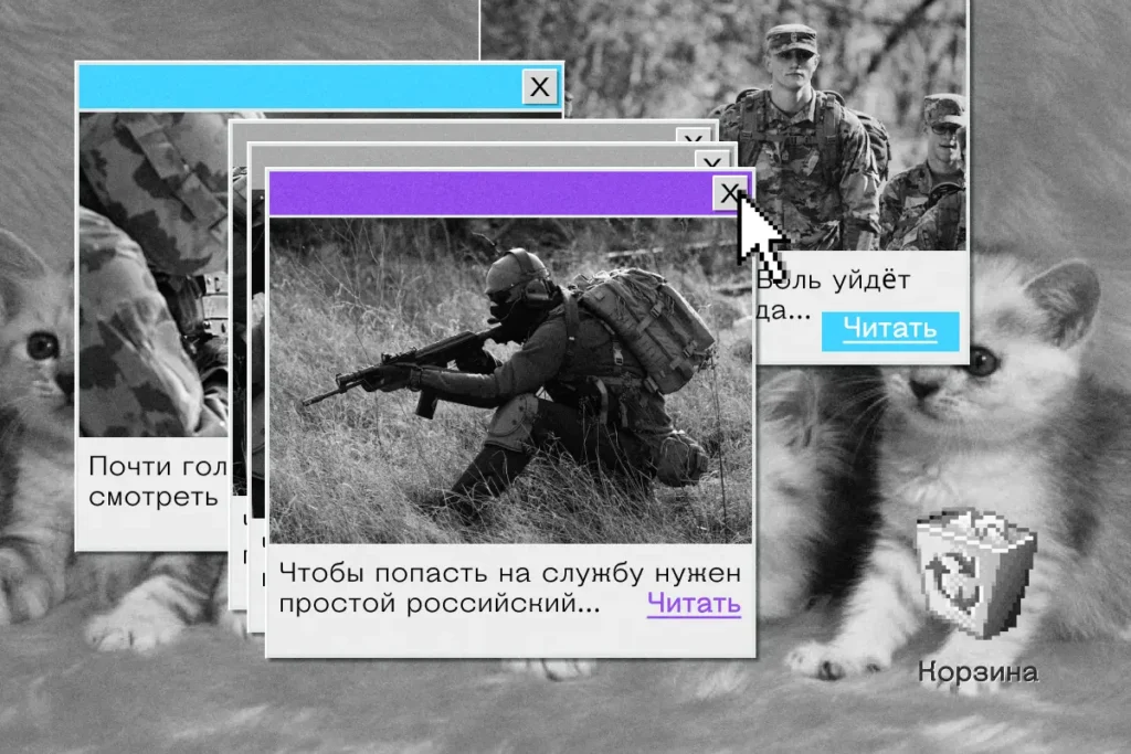 Каждое объявление, размещённое Минцифры, ведёт на один из двух сайтов: напрямую на Госуслуги или на поддомен ИРИi. Государственная услуга, продвижением которой занимается Минцифры, — это «Военная служба по контракту». Пользователям, которые кликнули на «социальную рекламу» от ведомства, на оформленной в стилистике Госуслуг странице предлагают подписать контракт с Минобороны.