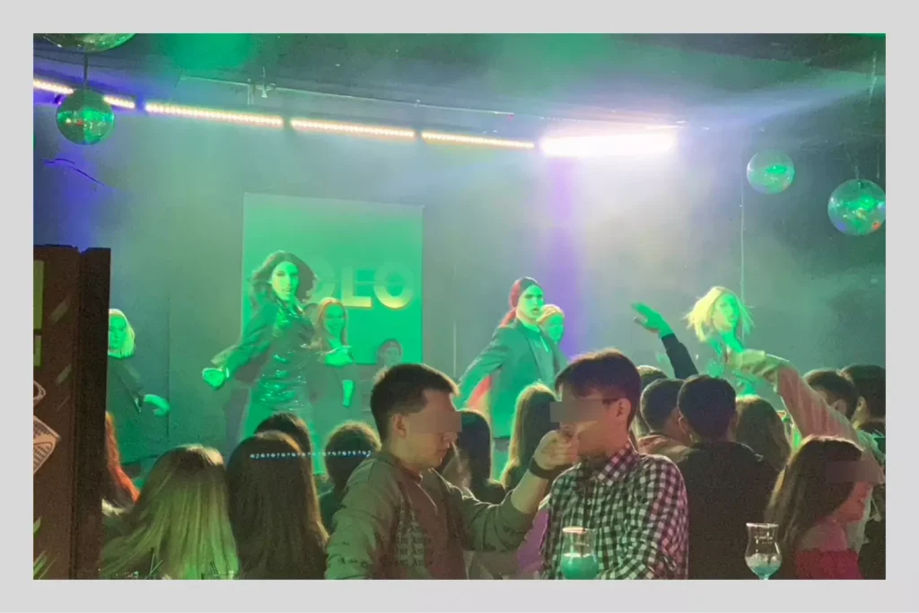 Корреспондент «Вёрстки» посетил этот клуб в апреле 2023 года. На входе — секундный фейсконтроль и проверка документов, турникет, быстрый досмотр без металлоискателя, заклеивание камеры (только основной, а фронтальной пользоваться можно). В зале уже шло травести-шоу. Будним вечером дрэг-королевы выступали от силы для десятка людей на танцполе. Дальше — караоке-зал, где несколько молодых парней в модной одежде пели песни Алёны Швец, Мота и Инстасамки.