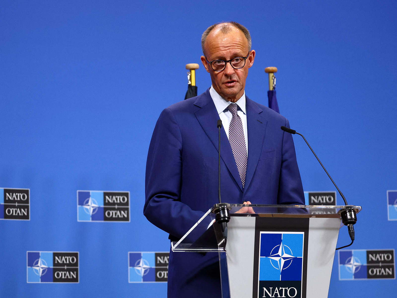 Фото: Канцлер Германии Фридрих Мерц общается с прессой в штаб-квартире НАТО в Брюсселе, 9 мая 2025 года. REUTERS/Piroschka van de Wouw