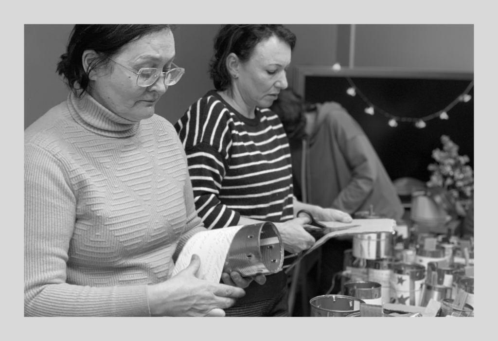 Светлана руководит волонтёрами: «Начинается работа с банкой с того, что она обрабатывается. Острые края подгибаем плоскогубцами. Этикетки отдираем, чтобы они не коптили при нагревании. Фитиль делаем из гофрокартона, его надо скручивать и в банку вставлять. Это процесс творческий: как нравится, так и делаем. Любая банка найдёт солдата».