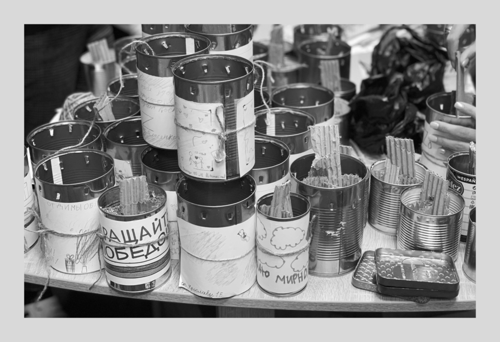 К каждой банке волонтёры бечёвкой привязывают записки для солдат. Их подготовили школьники. Среди волонтёров немало педагогов, и на уроках они просят учеников писать письма с пожеланиями и рисовать открытки для солдат, а потом пачками приносят их на мастер-классы. На бумажках, исписанных детскими почерками, неумело нарисованы триколоры, георгиевские ленты, буквы Z и V.