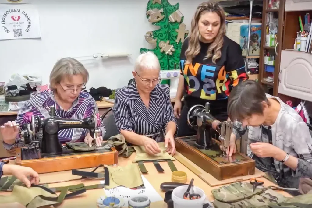 Так, участницы кемеровского отделения волонтёрского движения «Золотые руки ангела» шьют и вяжут для нужд армии в помещении местного культурного центра. В 2023 году участницы кемеровского отделения, по их собственным подсчетам, отшили 2 375 тактических рюкзаков, более 1000 пятиточечников и подсумков, более 500 нашлемников.