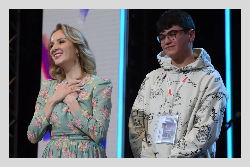 На следующую встречу школьников — Всероссийский съезд движения детей и молодёжи под патронажем Сергея Кириенко под названием «Движение Первых» — Мария Львова-Белова взяла своего приёмного сына из Мариуполя. Подросток вышел на сцену в толстовке с принтом из ножей, роз, орлов, колючей проволоки и матрёшек.
