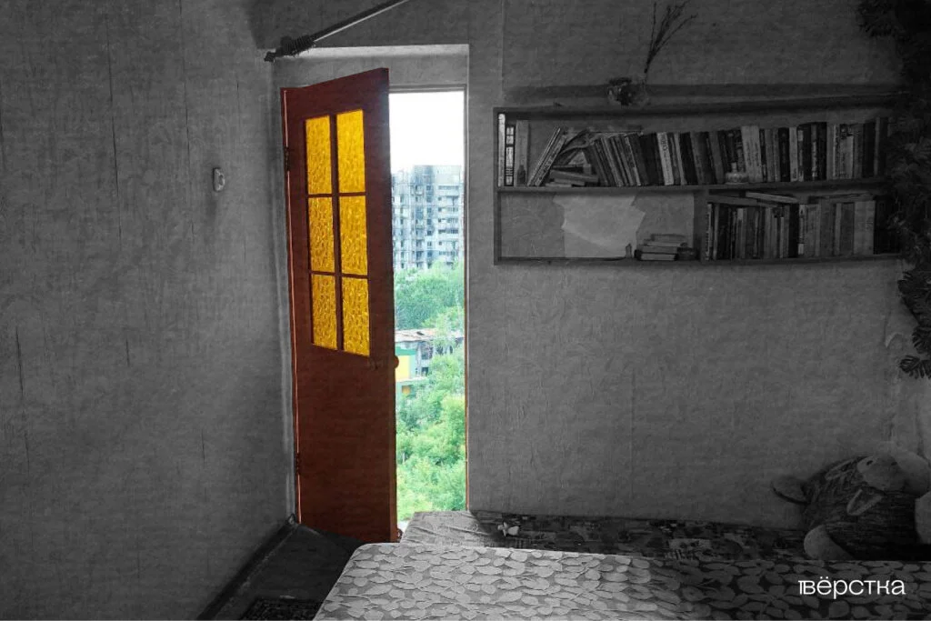 Когда я приходила во двор, часто видела на лавочке соседку, и она говорила: «У меня есть ключ от подъезда, давай я тебе открою». Заходишь в подъезд, стены облицованы плиткой лавандового цвета. Наш этаж — седьмой. Как попадаешь в квартиру, слева видишь коридор, а справа — комнату, где в разное время жили то я, то мама, то моя сестра. Чтобы попасть туда, нужно было пройти сквозь шторку из деревянных висюлек. В комнате — журнальный столик, диван и рабочий стол, за которым я делала уроки, когда ещё ходила в школу. Здесь я оставила часть своих вещей после переезда в Харьков. И когда уже мама поселилась в этой комнате, бабушка всё ругалась: «Сделайте что-то со своими вещами, уже некуда складывать».