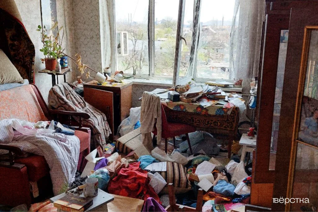 За стеной нашей квартиры образовалась пропасть вместо соседской трёшки — это обнаружила сестра, когда вернулась позже в дом за вещами. Все вещи были разбросаны. Бабушкин немецкий сундук украли мародёры вместе с другим ценным. Я просила забрать своё синее платье в белый горошек. Очень хотелось забрать фотографии, которые хранились за стеклом в бабушкином серванте, но сестра сказала, что растерялась: не понимала, за что браться, где искать вещи.