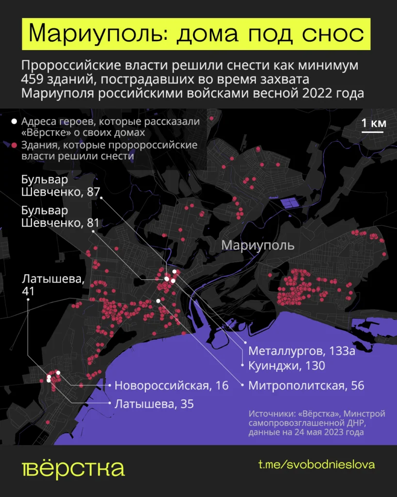 Новые власти Мариуполя гордятся темпами восстановления города. Во дворах, где ещё недавно жили десятки тысяч мариупольцев, сейчас пустыри — там закладывают фундаменты под новые ЖК. Пророссийские власти решили снести как минимум 459 зданий, пострадавших от бомбёжек и горевших весной 2022 года, — свежие распоряжения о сносе выходят каждый месяцi.