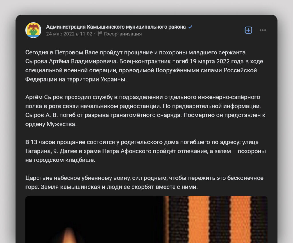 31-летний Артём — сын Любови и Владимира Сыровых — погиб в марте. Он был профессиональным военным, начальником радиостанции подразделения отдельного инженерно-сапёрного полка. Его похоронили на родине — в посёлке Петров Вал Волгоградской области — через несколько дней после смерти.