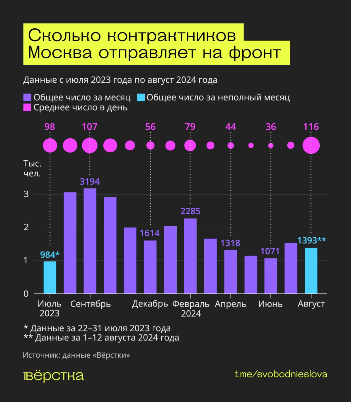 «Статистику по дням начали вести только в конце июля 2023 года, и это уже было начало спада потока, — говорит источник „Вёрстки“ в московской мэрии. — Если условно зимой-весной прошлого года контракты подписывали по 130–140 кандидатов, к лету уже до сотни откатилось число».