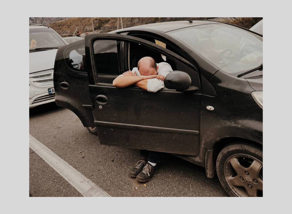 «Это полный хаос, — рассказывает Руслан. — Машины стоят где-то в два ряда, где-то в три, как позволяет дорога. Люди там практически живут: умываются из бутылок, выгуливают собак. Но еда, вода и бензин у многих заканчиваются».