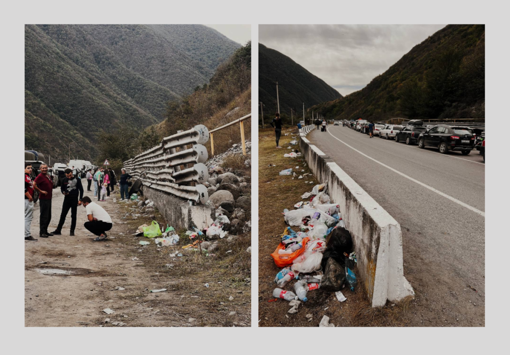 В нейтральной зоне тоже выстроилась длинная очередь. Сначала, по словам Антона, там был «хаос и беспорядок», но потом пограничники привлекли волонтёров. Те выстроили людей в небольшие шеренги и стали пропускать на КПП группами по 50 человек. Также они собирали пластиковые бутылки, наливали воду из ближайшего родника и раздавали желающим. «Ощущалось, что всё цивилизованнее, чем со стороны России», — говорит Антон.