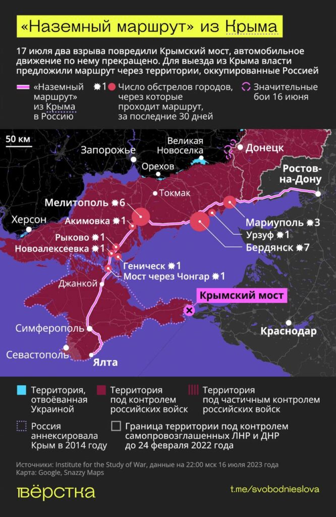 По данным сервиса «Яндекс. Карты», расстояние «по земле» между Ростовом-на-Дону, последним российским областным центром перед оккупированными территориями и курортом южного берега Крыма — Ялтой — составляет около 700 км. Сейчас сервис не прокладывает ни одного маршрута между этими двумя городами, «теряя дорогу» возле взорванного ракетным ударом ВСУ почти месяц назад и уже восстановленного Чонгарского моста.