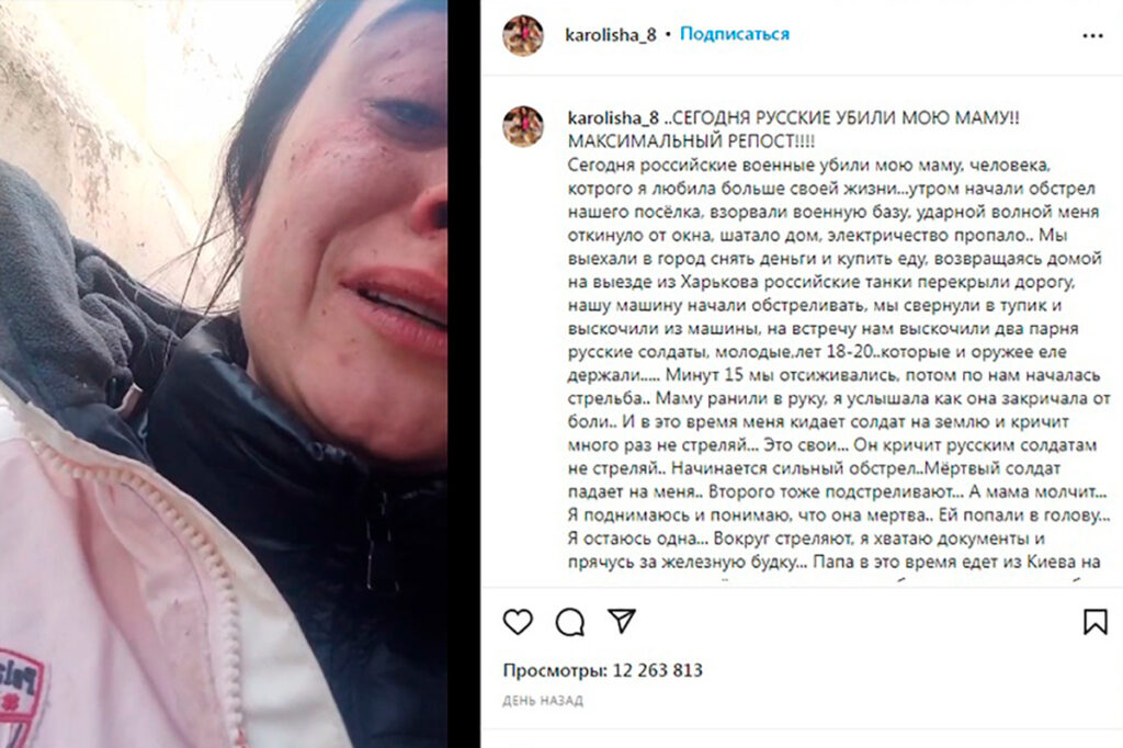 На следующий день, 25 февраля, Каролина вернулась на место обстрела. «Там уже была украинская армия, они исследовали территорию. Мы приехали за телом: там было тело мамы, тело этого русского солдата», — рассказала она «Вёрстке». Как звали военного, она не знала: он называл Каролине своё имя, но та была в слишком большом стрессе, чтобы его запомнить.