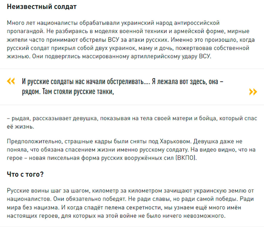 Через неделю «Царьград» тоже рассказал о подвиге «неизвестного солдата». В материале говорится, что военный «прикрыл собой двух украинок», которые подверглись «массированному артиллерийскому удару ВСУ». По мнению журналистов «Царьграда», Каролина якобы приняла украинские войска за российские, потому что «много лет националисты обрабатывали украинский народ антироссийской пропагандой».