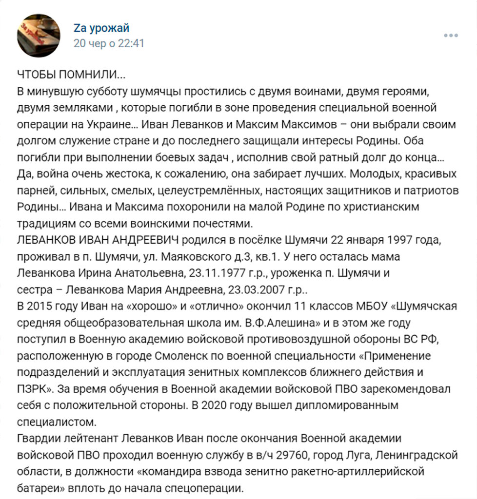 В России имя погибшего военного впервые упомянули лишь спустя три месяца. Шумячская районная газета «За урожай» 20 июня сообщила в соцсетях о похоронах двух военнослужащих в Смоленской области. Одним из них был Леванков. В заметке не указали дату его смерти и не упомянули поступок, который он совершил. Там сказано лишь, что он погиб «при выполнении боевых задач, исполнив свой ратный долг до конца».