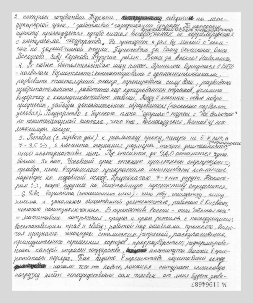 Относительно себя я вижу несколько вариантов будущего: шью робу, спецодежду, пишу письма и занимаюсь общественной деятельностью, работаю в RusNews, помогаю политзаключенным. В перспективе России — очень «темная ночь» = масштабные потрясения, кризис и крах режима с последующими: восстановлениями прав и свобод; работой над ошибками прошлого, включая признание геноцидом сталинских репрессий, раскулачивания, принудительного переселения народов, продразвёрстки; реформирование каждой отрасли государства, институтов власти в приоритетном порядке. Как видите, в перспективе позитивный исход — начало чего-то нового, локация — антураж, смысловую нагрузку несет непосредственно сам человек. От меня будет зависеть уровень адаптации в колонии и объем позитивного опыта, приобретенного под стражей (негативный здесь же оставлю, зачем он на свободе).