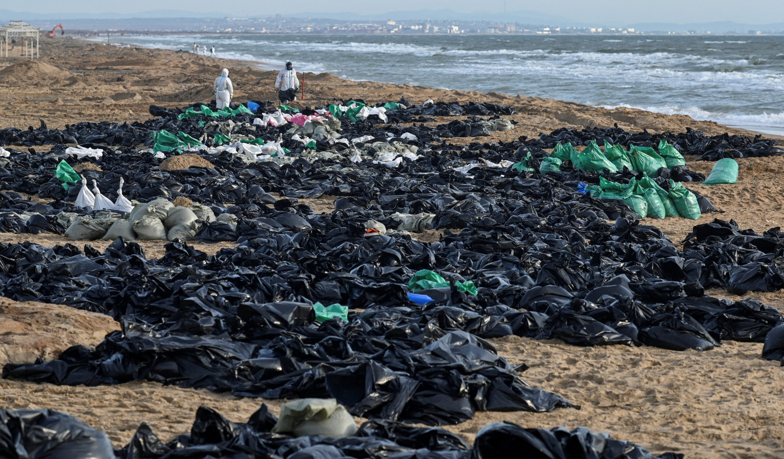 Фото: Волонтеры очищают побережье от мазута после крушения двух танкеров в посёлке Благовещенская недалеко от Анапы в Краснодарском крае, 21 декабря 2024 года. Sergey Pivovarov/Reuters