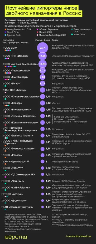 Чипы двойного назначения в Россию возят сотни компаний. «Вёрстка» составила список крупнейших импортёров этих компонентов. Из 25 крупнейших импортёров, как мы смогли установить, 11 — прямые поставщики предприятий ВПК, в том числе первые пять крупнейших.