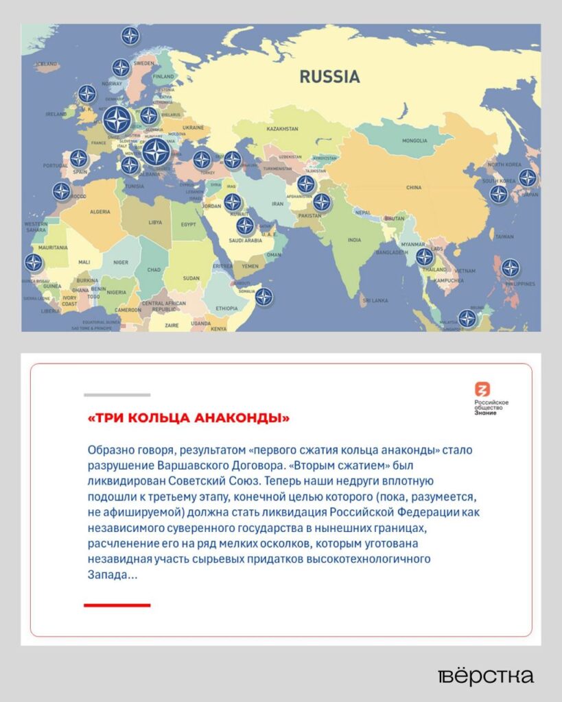 Как говорится в презентации, главный враг на пути к полному суверенитету России — это НАТО и США. Вайц демонстрирует карты, из которых следует, что РФ буквально находится в кольце военных баз Североатлантического альянса. При этом вокруг России — сплошные очаги напряженности. Например, ситуацию в Грузии, «потепление в отношениях» с которой «вызывает неприкрытую тревогу на Западе», Вайц называет «танцем на углях», а в соседней Армении и вовсе находится «огненный пояс». Не забывает лектор и о Китае, от которого России не стоит ждать ничего хорошего в «горниле», то есть в Центральной Азии.