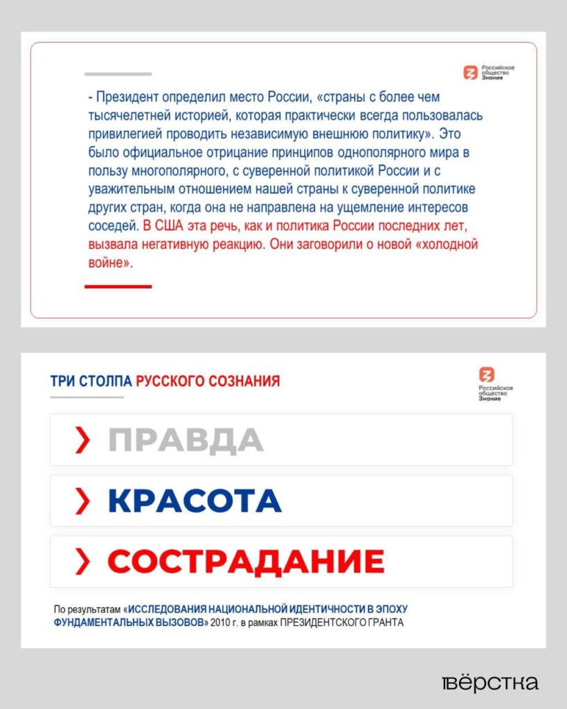 Согласно презентации, «большинство народа» поддерживает Путина в «отстаивании суверенитета», которым он занимается «с самого начала» своего правления. В качестве примера «отстаивания» Вайц приводит антизападную «Мюнхенскую речь» Путина в 2007 году, войну в Грузии 2008 года, аннексию Крыма («защита волеизъявления жителей» полуострова), а также нынешнюю войну в Украине.