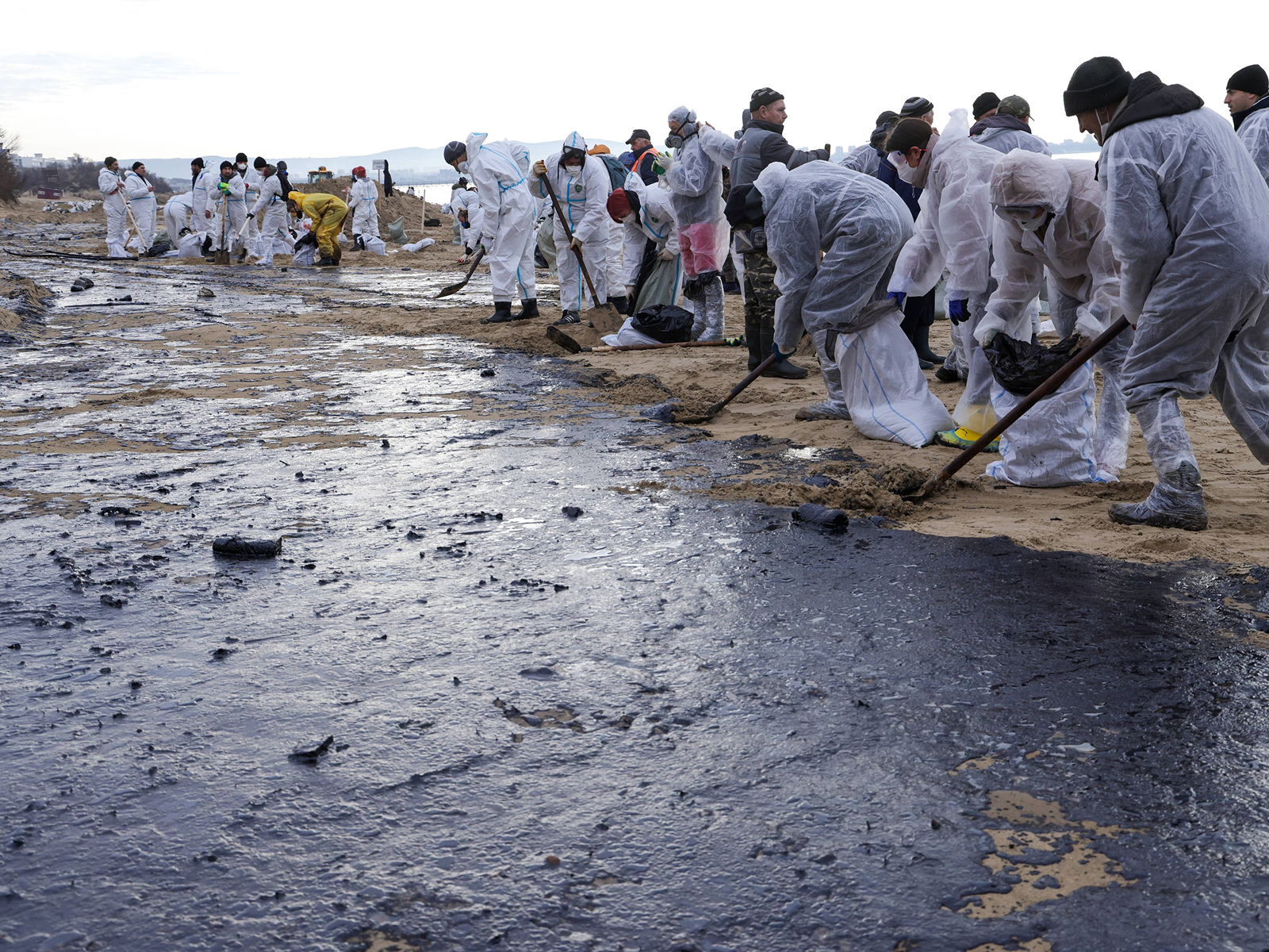 Фото: Волонтёры убирают пропитанный нефтью пляжный песок недалеко от черноморского курортного города Анапа после крушения 15 декабря нефтяных танкеров, 25 декабря 2024 года. Фото: Dmitry Feoktistov/TASS/Profimedia