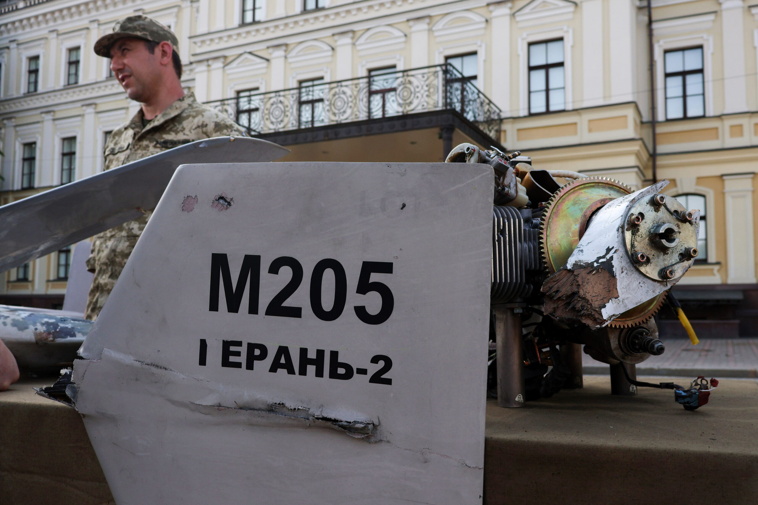 Фото: Фрагменты иранского дрона Shahed-136 (в России названного «Герань‑2»), установленные как символ войны в центре Киева. Aleksandr Gusev / SOPA Images/Sipa USA via Reuters