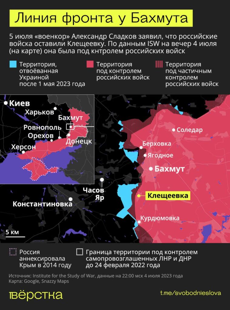 Кроме того, украинские военные пытаются занять северный и южный фланги Бахмута. По этому направлению в последние дни сообщалось об активных боях в районе села Клещеевка, что находится на 5 км южнее города. 5 июля «военкор» Александр Сладков заявил, что российские войска оставили это поселение, тем самым открыв для ВСУ одну из южных дорог на Бахмут. Однако украинские военные полное взятие села пока не подтвердили: в Генштабе ВСУ заявили, что «имеют частичный успех, закрепляются на достигнутых рубежах».
