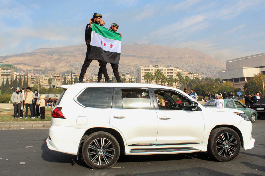 Люди держат флаг сирийской оппозиции, празднуя свержение президента Башара Асада, Дамаск, Сирия, 8 декабря 2024 года. REUTERS/Firas Makdesi