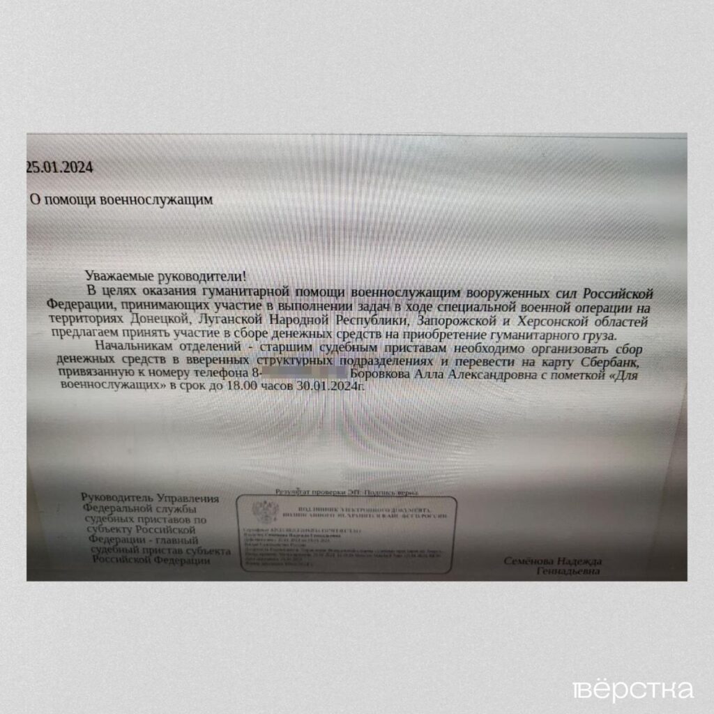Сотрудников управления ФССП по Тверской области заставляют сдавать деньги на гуманитарную помощь для российских военных. Как рассказал «Вёрстке» один из сотрудников региональной службы судебных приставов, 25 января на электронные почты отделов ведомства пришли письма с просьбой организовать сбор для «приобретения гуманитарного груза».