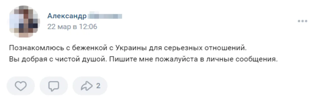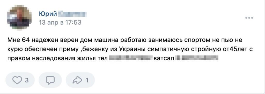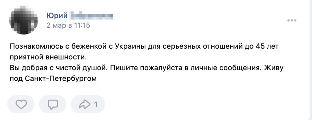 The posts showed up in both regional groups, such as «Settlers and Refugees in Kaluga» and «Helping Refugees in Saint Petersburg,» and in national online communities. In one popular group, called «Ukrainian Refugees,» which boasts nearly a thousand members, the first ads appeared in late February. In May, twenty-two men had authored posts offering to help Ukrainian women.