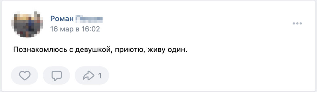A 31-year-old man from Taganrog, addressing himself as Vikentiy, wrote in a group called «Helping Refugees in Saint Petersburg» that he was ready to help «a slim girl.» He told us that he lived in a studio but was planning to buy a bigger home for himself and his future spouse, and was looking for a Ukrainian partner.