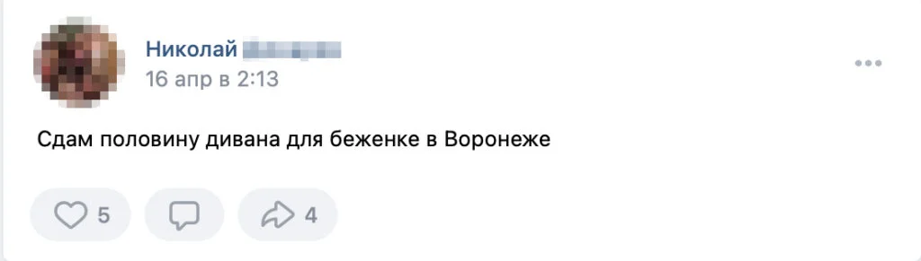 Nikolay: I will rent half of a couch to a Ukrainian refugee in Voronezh.