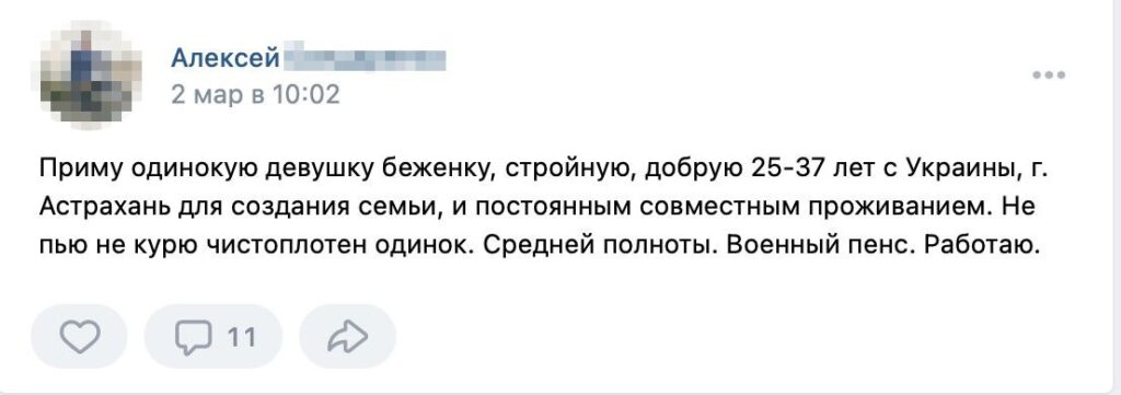 Since the beginning of the Russian invasion of Ukraine, hundreds of ads offering to help Ukrainian women have cropped up on the Russian social media network, VKontakte. Written predominantly by men, the ads promise housing for Ukrainian women and girls in exchange for a sexual partner, a spouse, or a housekeeper. Verstka spoke with dozens of authors of the ads to learn their stories and find out why they posted on social media.