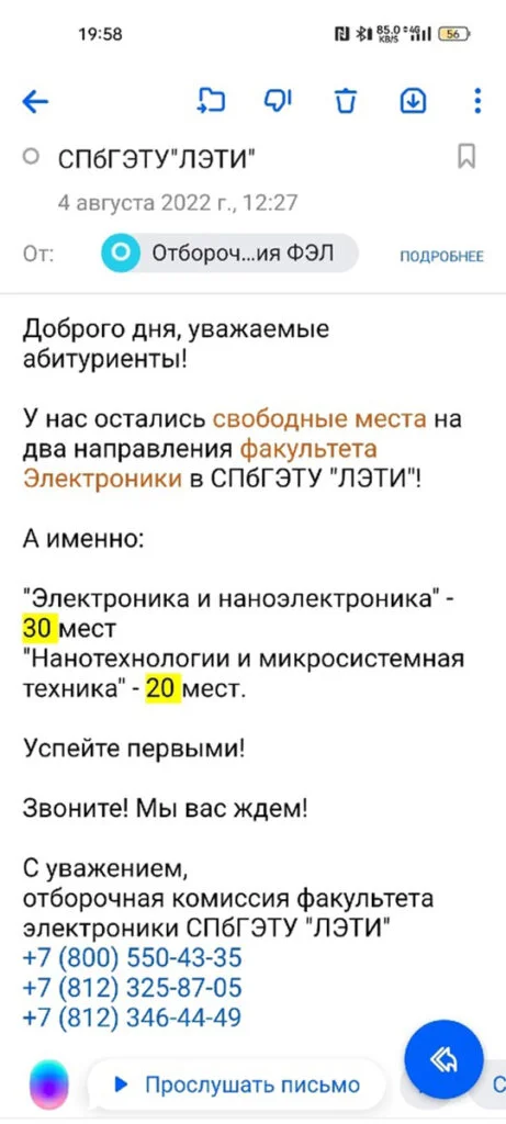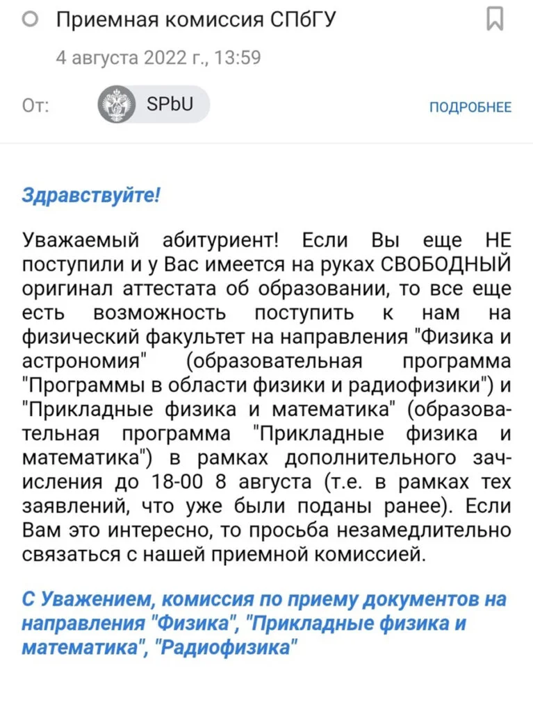 Как рассказали «Вёрстке» абитуриенты, дополнительный набор уже идёт вовсю. Помимо объявлений на сайтах и в соцсетях, вузы присылают выпускникам письма на почту, где зазывают их к себе. Например, в СПбГУ 4 августа были свободные места на физическом факультете, а в СПбГЭТУ «ЛЭТИ» — 50 мест на факультете электроники.