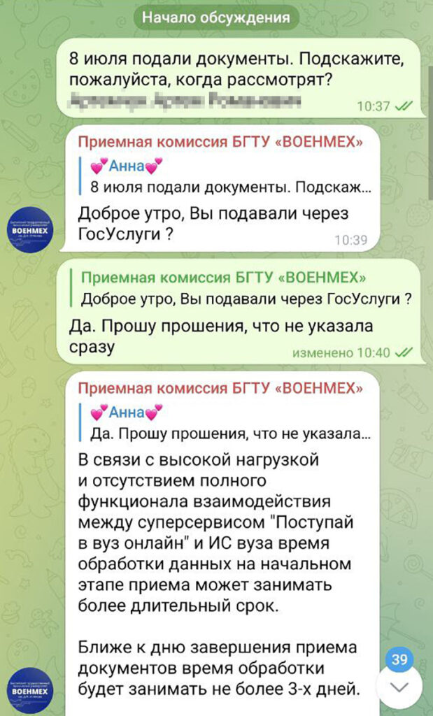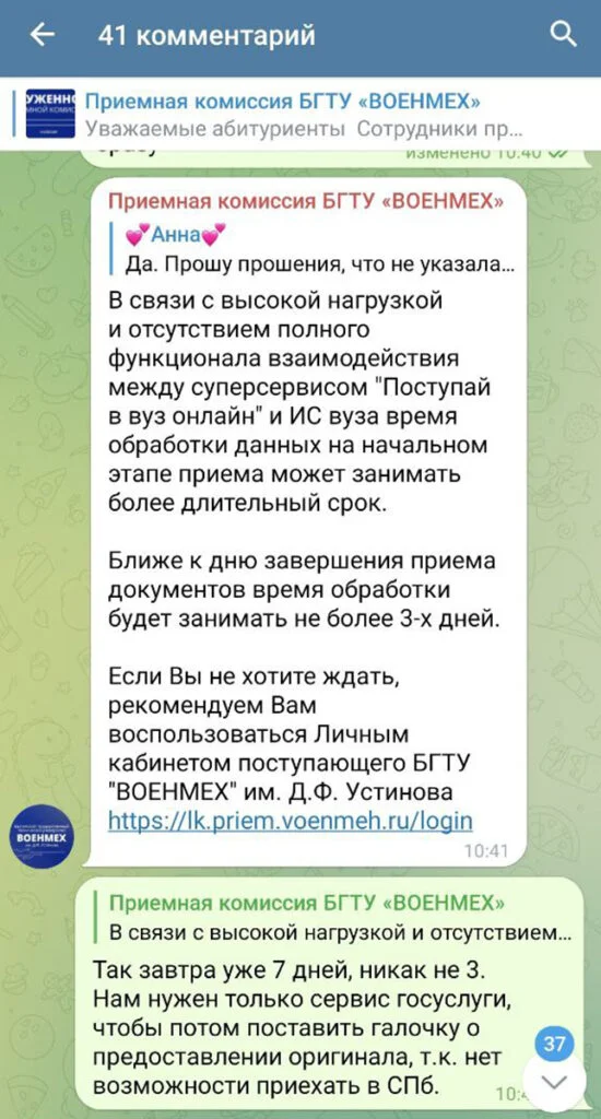 Мама абитуриента из Ярославской области Анна называет подачу документов через портал катастрофой. «Мы подали документы в несколько петербургских вузов на „Строительство“: в Аграрный, „Военмех“ имени Устинова, Петербургский государственный университет путей сообщения и СПбГТИ. Во все подавали через „Госуслуги“, потому что билеты до Петербурга нам не по карману. В итоге мне пришлось две недели названивать вузам и спрашивать, где наши документы, потому что вузы их просто не видели. Хотя на „Госуслугах“ было написано, что всё отправлено», — рассказывает Анна.