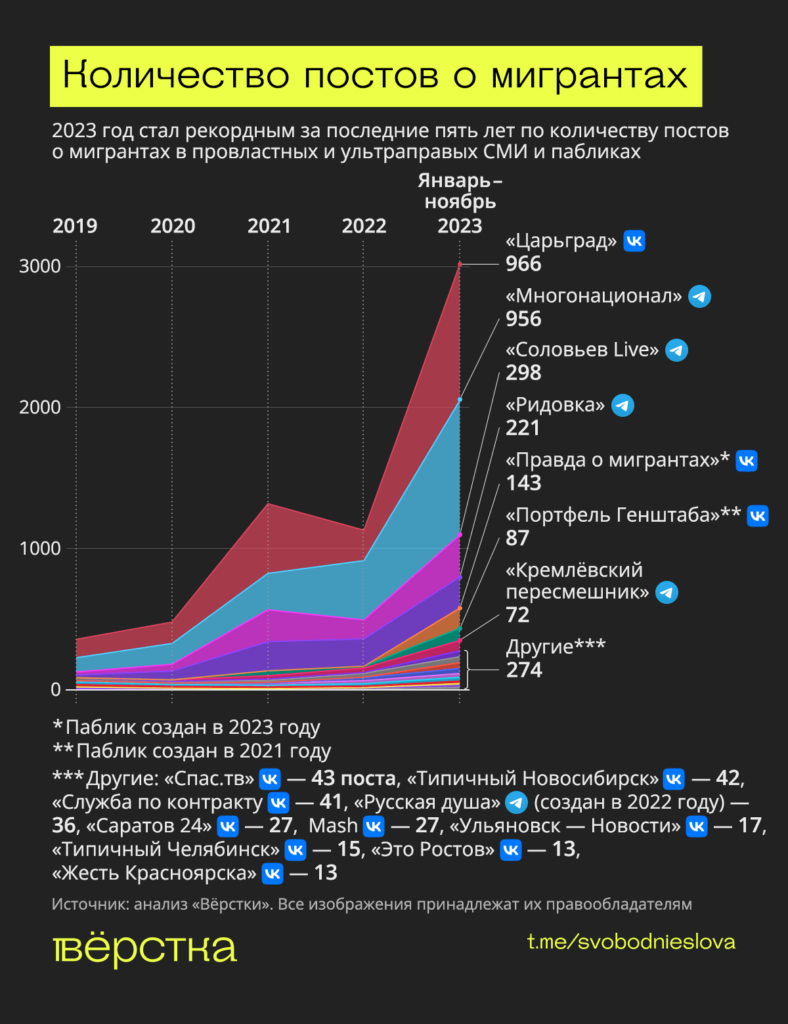 Часть из них, как выяснила «Вёрстка», посвящают теме мигрантов не более 2–3 постов в год, и 2023 год никак не изменил эту тенденцию. Другие, напротив, во втором полугодии 2023 года стали намного активнее, чем обычно, писать о мигрантах. Среди них — провластные и консервативные СМИ, некоторые региональные новостные паблики и ультраправые сообщества в Тelegram и «Вконтакте».