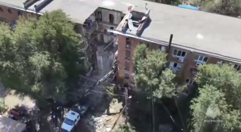 Фото: Обрушившийся подъезд жилого дома в Астрахани, 28 июля 2025 года. Скриншот из видео. Официальный телеграм-канал МЧС/@mchs_official