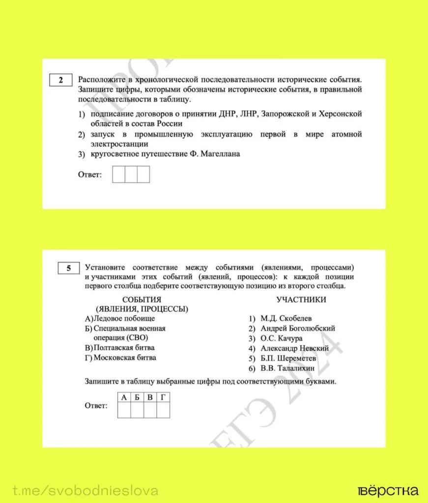 В одном из вопросов предлагают расположить в хронологическом порядке подписание «договоров о принятии ДНР, ЛНР, Запорожской и Херсонской областей в состав России», запуск первой в мире атомной электростанции и кругосветное путешествие Магеллана. В другом задании 11-классников просят соотнести Ледовое побоище, СВО, Полтавскую и Московскую битвы с участниками этих событий.