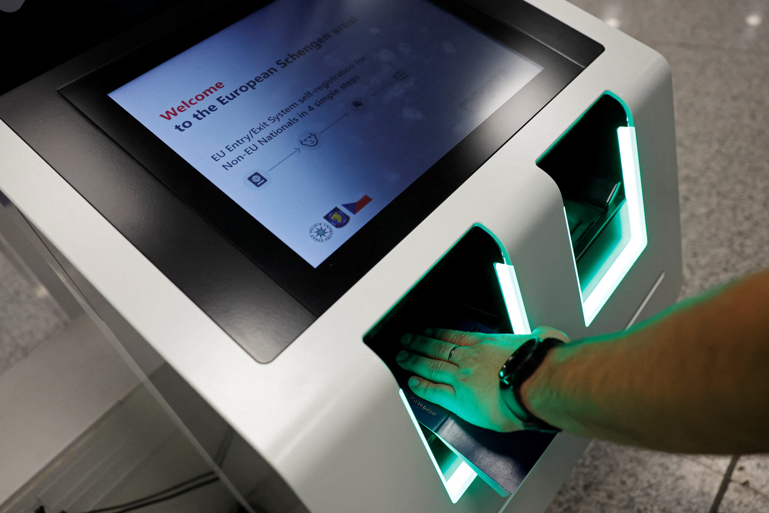 Фото: Полицейский сканирует паспорт во время демонстрации автоматизированного терминала для регистрации в системе въезда/выезда (Entry/Exit System, EES), которая обязывает всех граждан стран, не входящих в ЕС, при первом въезде в Шенгенскую зону предоставлять персональные данные, включая отпечатки пальцев и изображения лица. Аэропорт Вацлава Гавела в Праге, 14 октября 2025 года. REUTERS/David W Cerny