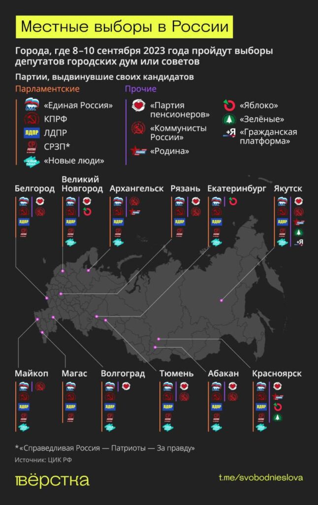 ▫️ Городские представительные органы изберут в 11 столицах регионов, а в Хабаровске состоятся единственные в 2023 году прямые выборы мэра регионального центра. Проблемными для единороссов могут стать голосования в Великом Новгороде (там в 2018 году победили кандидаты от КПРФ), а также в Красноярске, Екатеринбурге, Архангельске и Якутске, где у депутатов от партии власти сейчас нет убедительного численного преимущества над соперниками