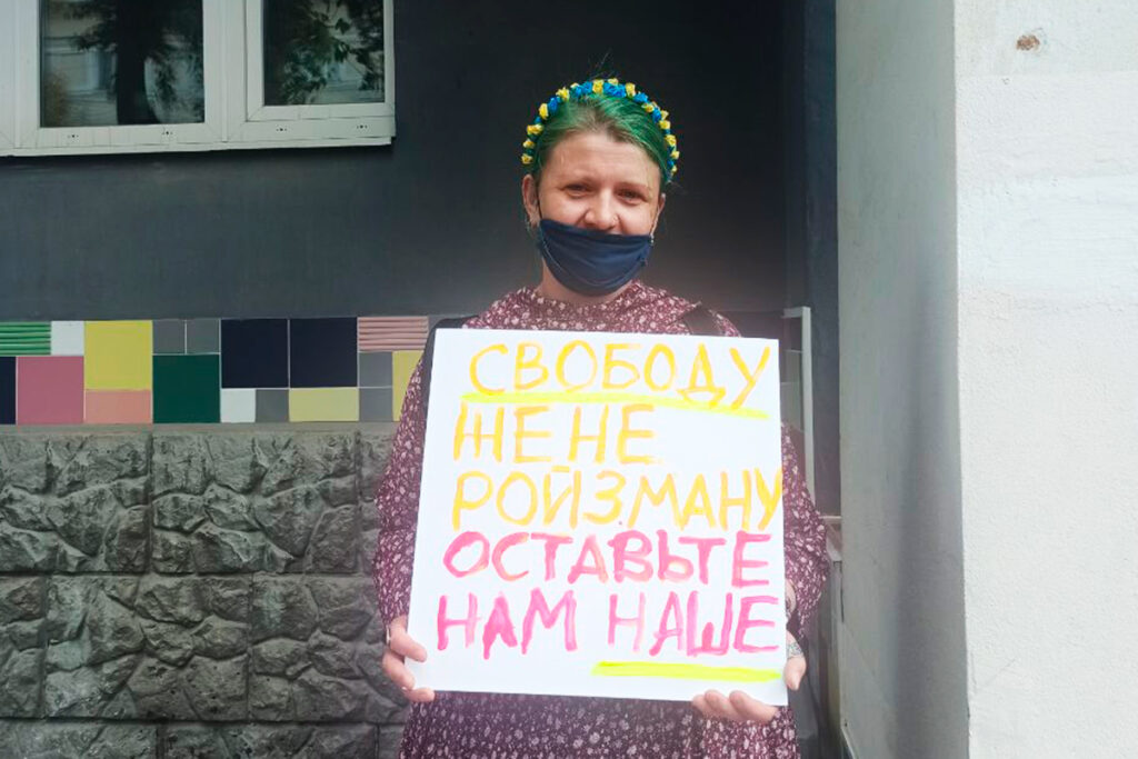 Пока Евгений Ройзман находится в «Невьянской иконе», у входа в Музей проходит одиночный пикет. Девушка с венком в жёлто-голубых цветах стоит с плакатом: «Свободу Жене Ройзману. Оставьте нам наше». К ней подходит пожилая женщина: